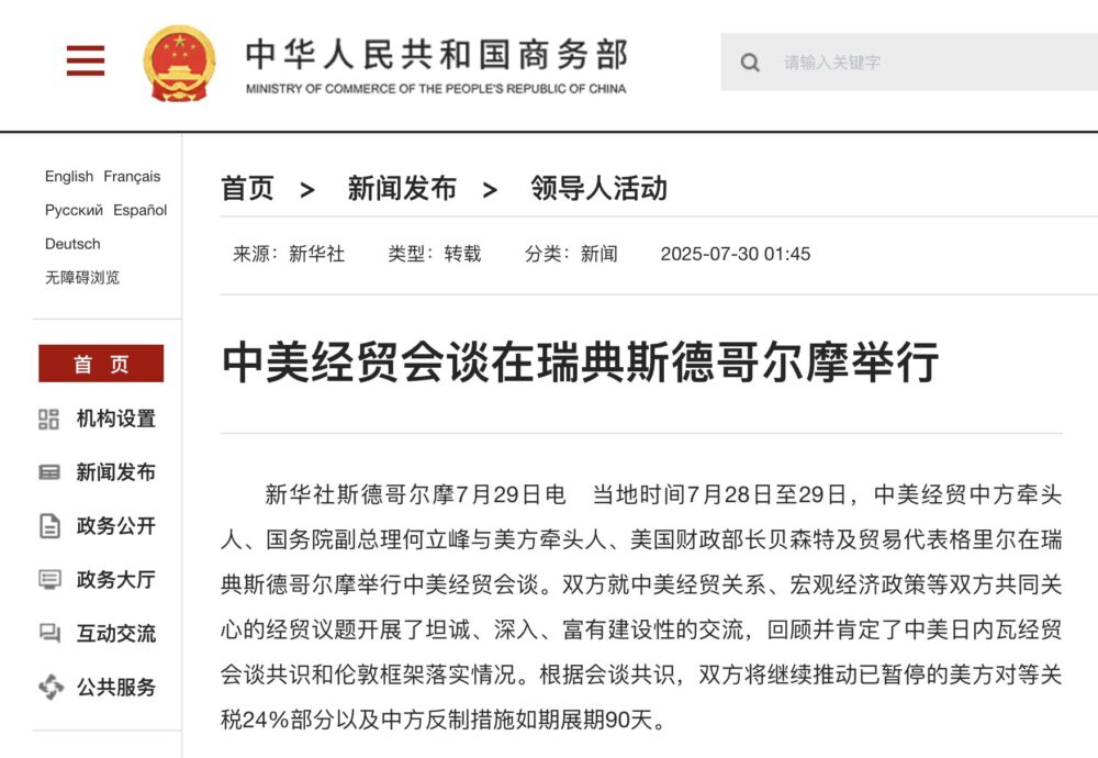 中国商務部の何亜東報道官は7月31日、定例記者会見で、米中両国がストックホルムにおける経済貿易協議の共通認識に基づき、米国側が一時停止していた24%の相互関税措置および中国側の報復関税について、それぞれ90日間の延長措置を講じる方針となったと明らかにした。これにより中米経済関係のさらなる安定化が図られ、世界経済に対してもより多くの確実性がもたらされると強調された。