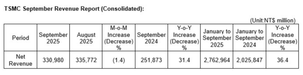 半導体受託生産(ファウンドリー)世界大手の台湾積体電路製造(TSMC、台積電)が9日、2025年9月の売上高が前年同月比31.4%増の3309億8000万台湾元(約1兆5680億円)となったと発表した。AI(人工知能)関連需要の急増が大きく寄与した。
