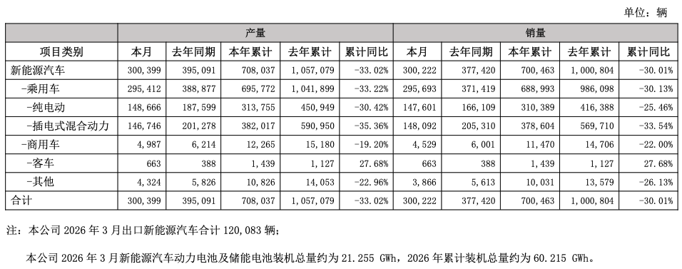 中国の電気自動車(EV)大手、比亜迪(BYD、広東省深セン市)が1日に発表した2026年3月の新エネルギー車(NEV)の新車販売台数は前年同月比20.5%減の30万222台だった。このうち乗用車は20.4%減の29万5693台。